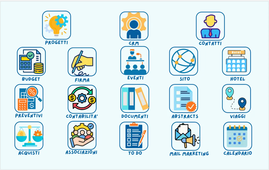 iValorize è concepita in moduli utilizzabili singolarmente o interconnessi fra loro. Scalabile fino a creare un ecosistema evoluto per gestire agenzia, eventi, comunicazione e molto altro...